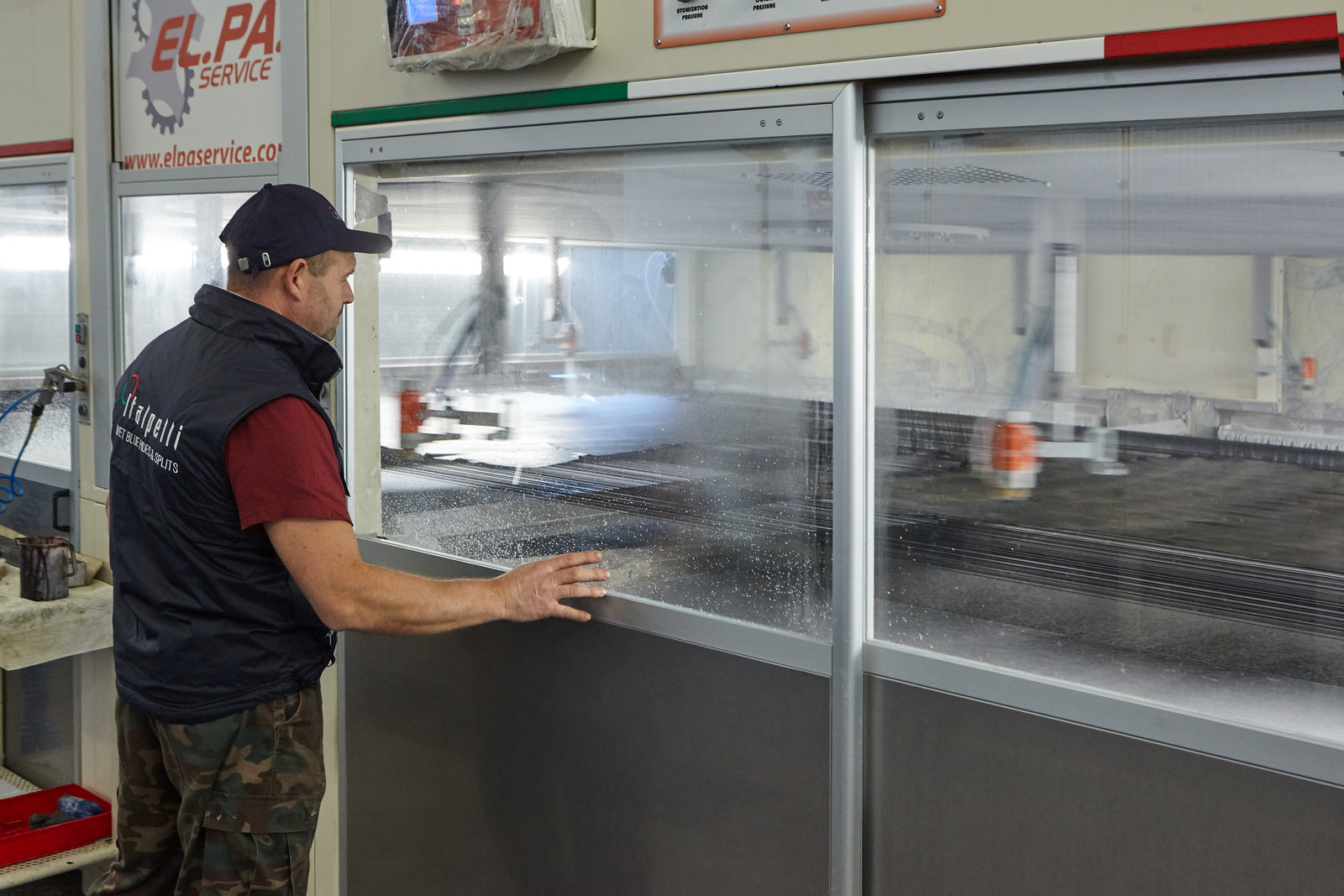 Le pelli vengono inserite in cabine all’interno delle quali una o più giostre di pistole, effettuando movimenti circolatori ad alta velocità, spruzzano delle finissime goccioline sulla superficie delle pelli creando così gli effetti desiderati.